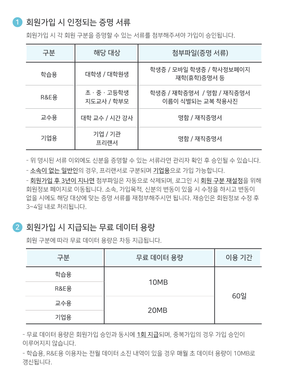 인정되는 증명서류 및 무료데이터용량 지급 관련 안내